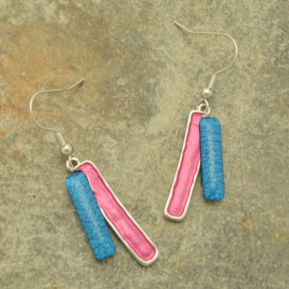 Featuring a strip of bright blue marble resin alongside a pink painted piece, these attractive earrings are unusual and in a great colour combination. The earrings hang approx 2.8cm from fish hooks.