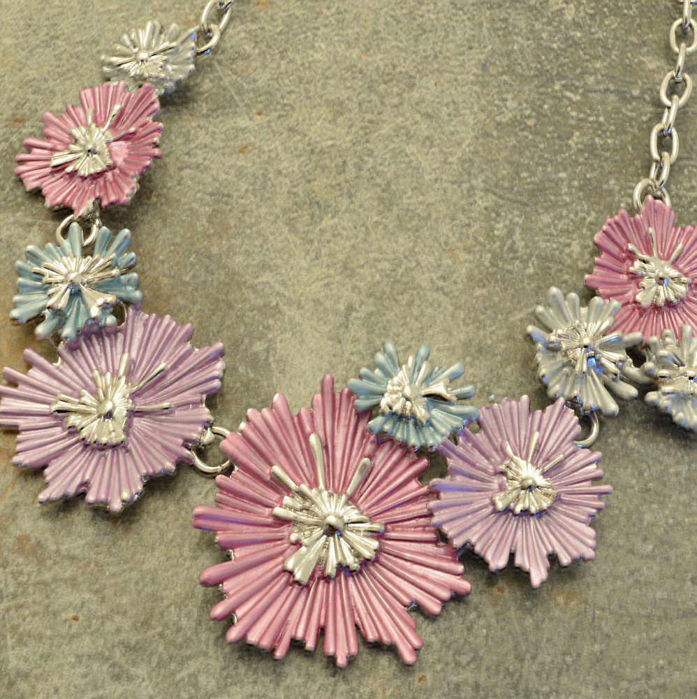 The Delosperma or ice plant has stunning flowers, which shimmer in the light as though covered with frost. They’ve inspired a really pretty necklace in pink, lilac, ice blue and silver-grey with bold silver-coloured centres. The largest flower is approximately 3.5cm in diameter. The necklace is 41cm or 16″ in length and fastens with a lobster clasp and 5cm extension chain.