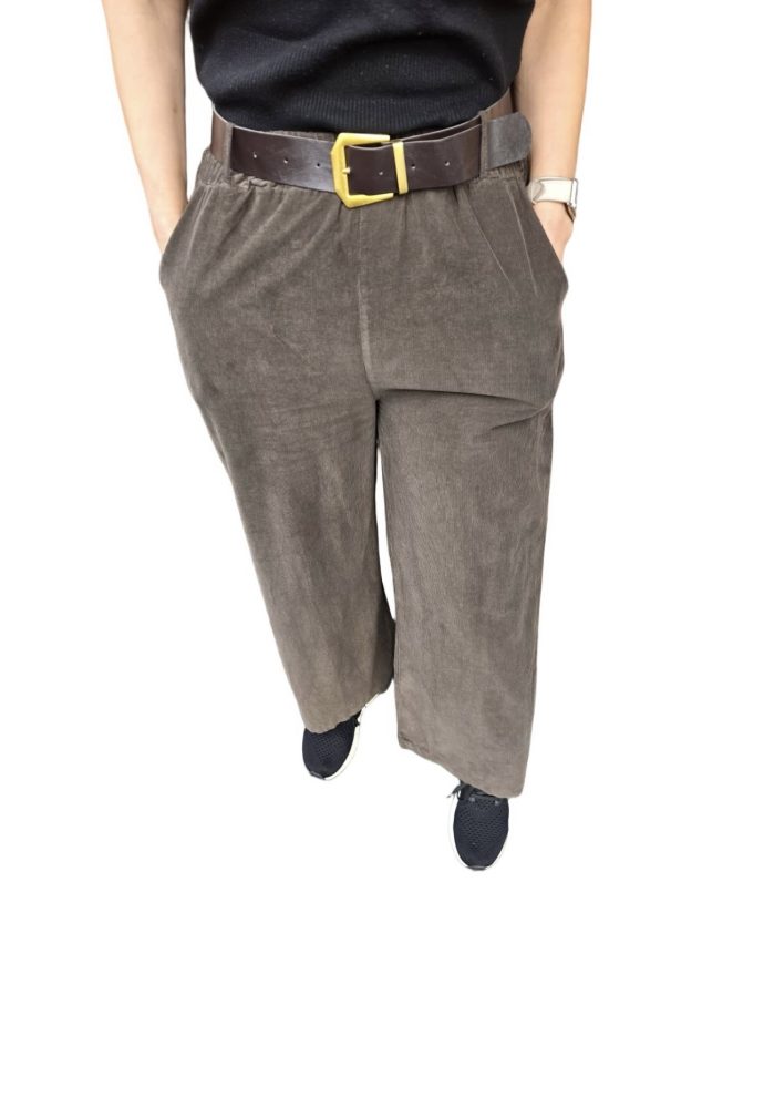Soft cord fabric, stretch waist, wide leg style with two side pockets and leather buckle belt.