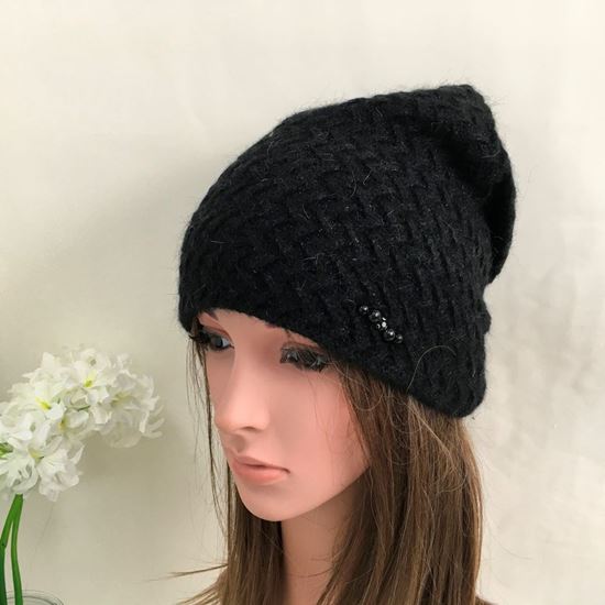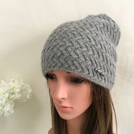 Lovely detail knitted hats in light grey, beige and black with pearl detail to side