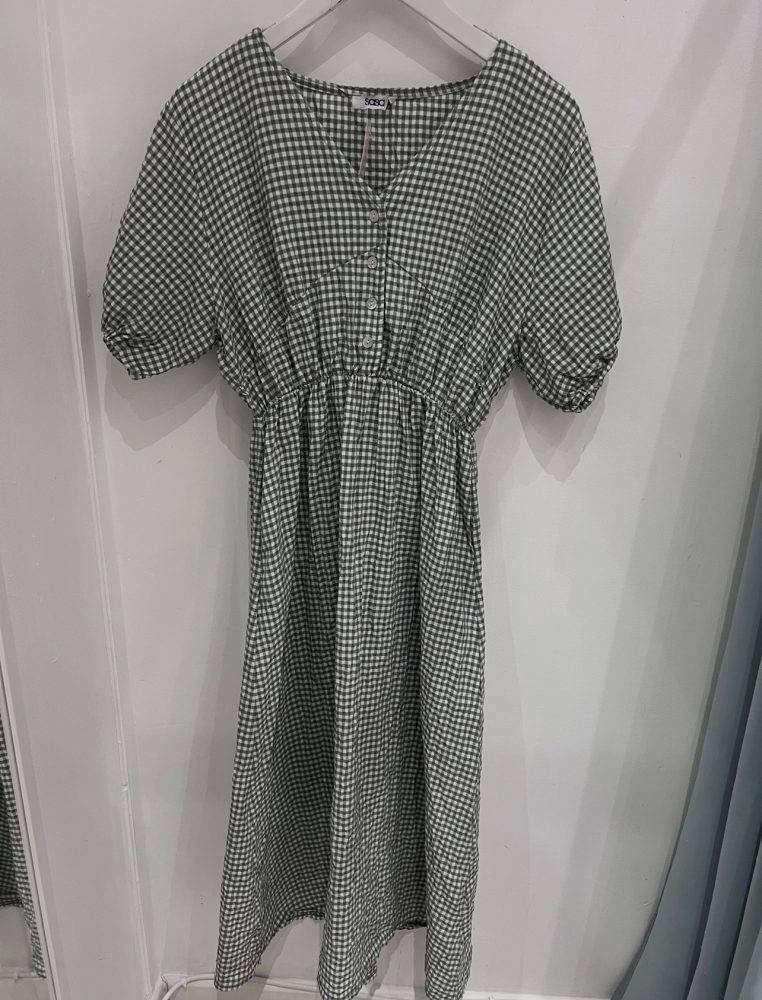 A lovely gingham print dress with short sleeves, v neck and elasticated waist.
