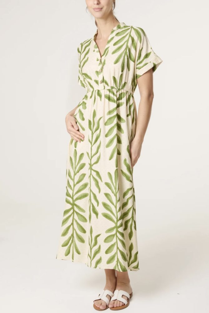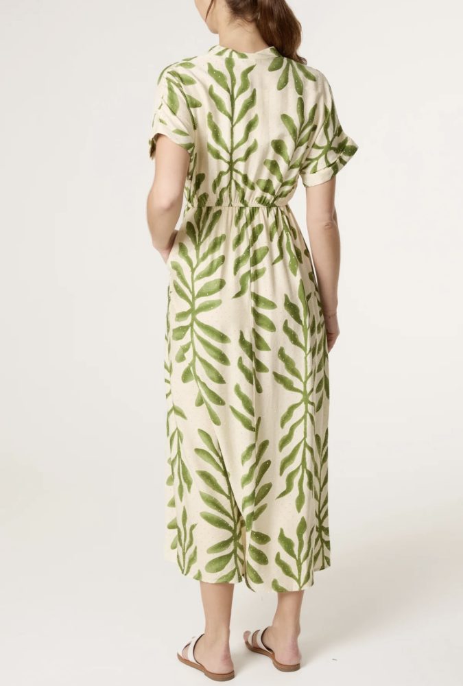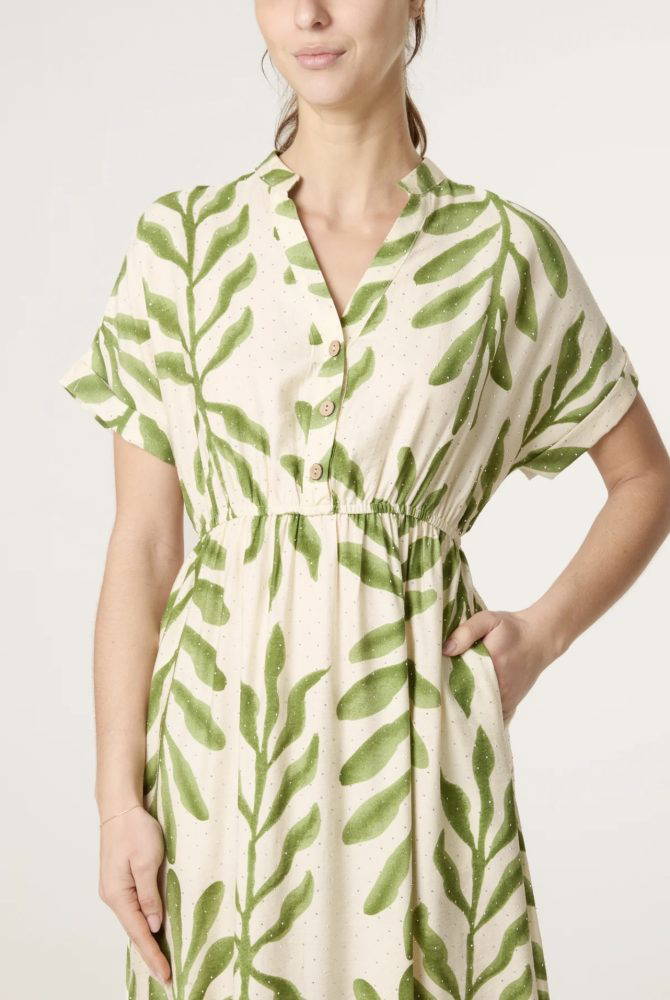 Leaf print embellished open collar dress with buttons to bodice.Elasticated waist, short sleeves and pockets