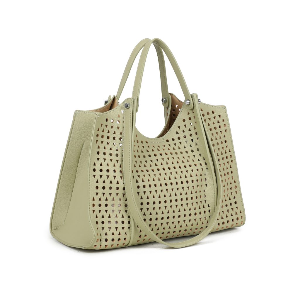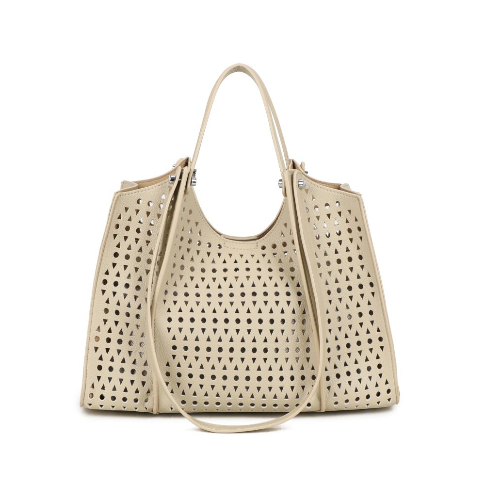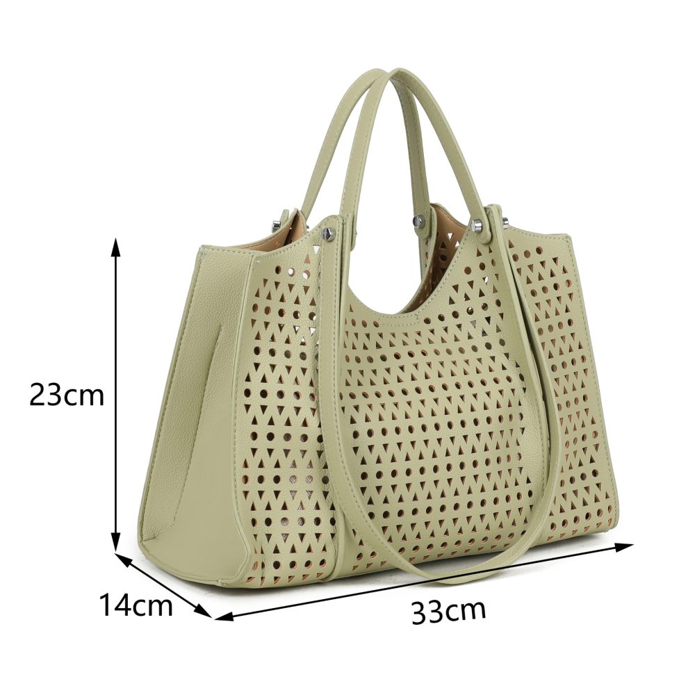 A handbag with laser cut material all round and a top zip closure. Double length strap and removable bag with internal pocket.