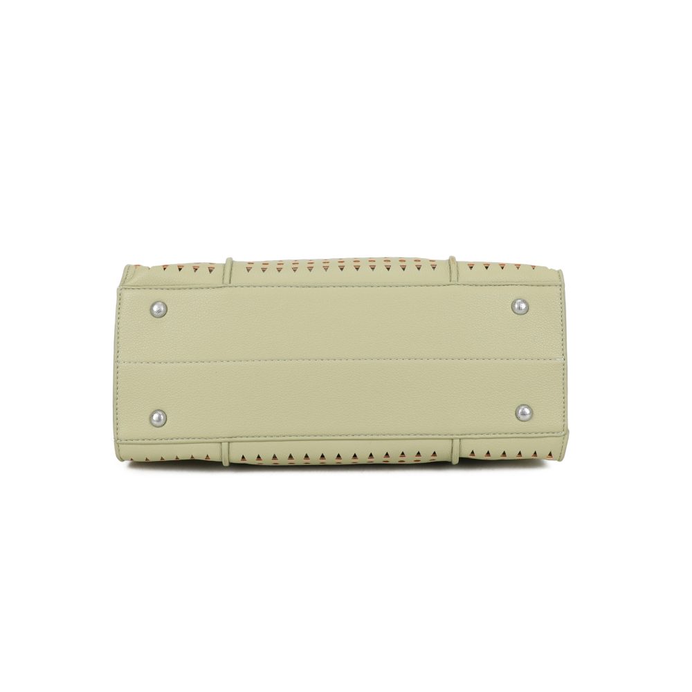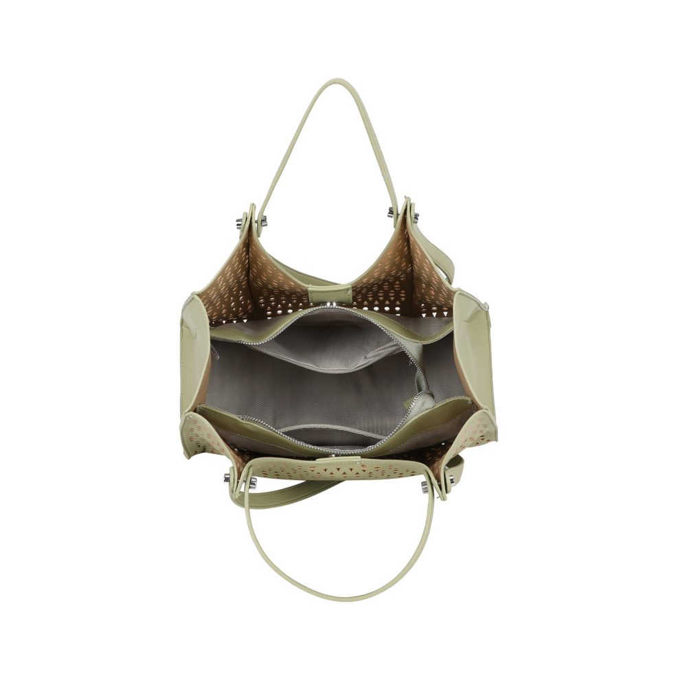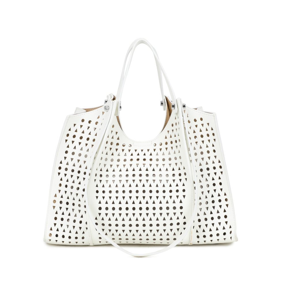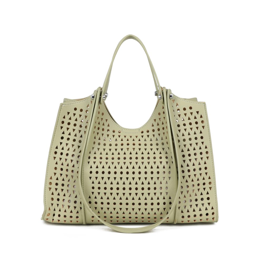 A handbag with laser cut material all round and a top zip closure. Double length strap and removable bag with internal pocket.