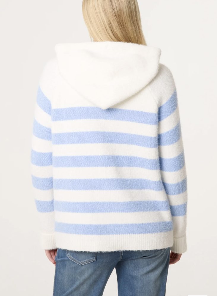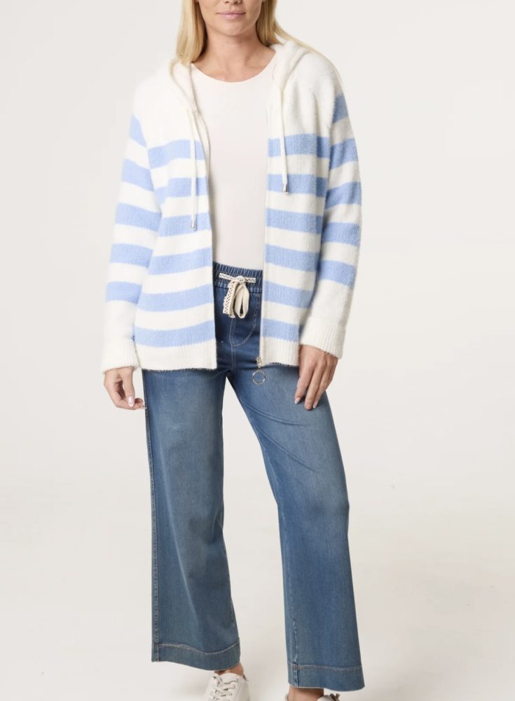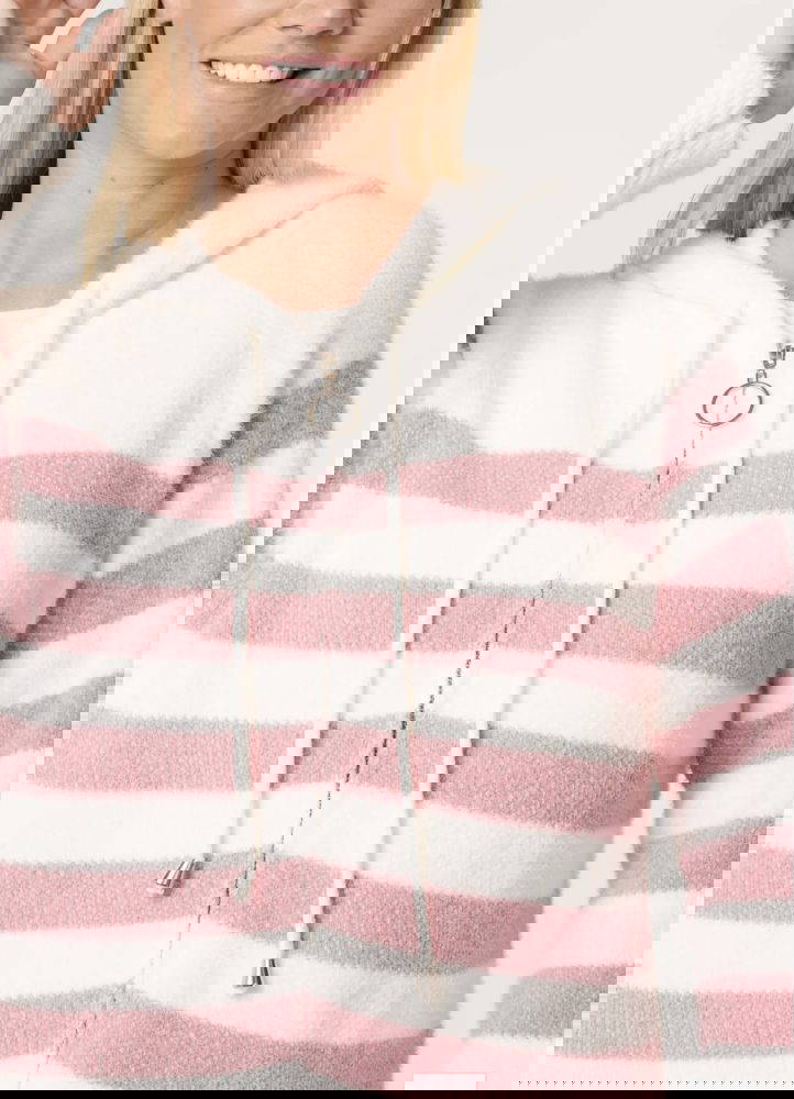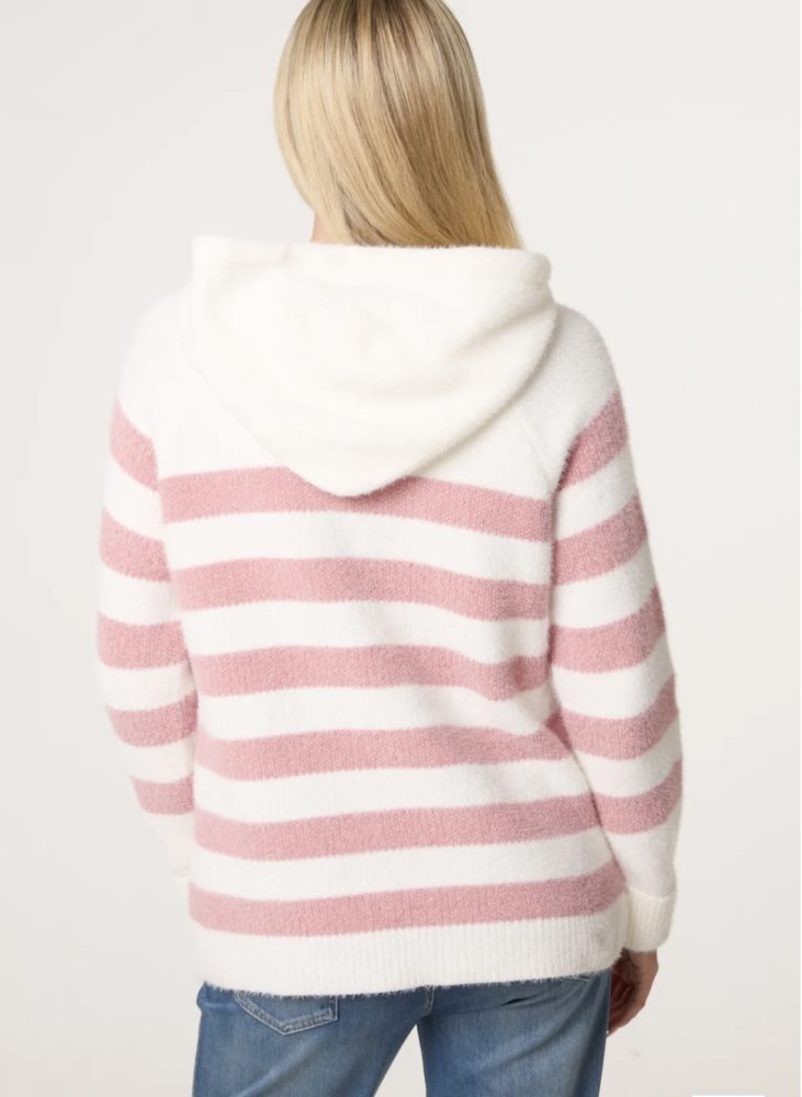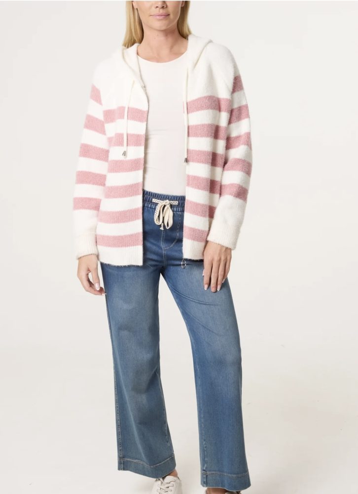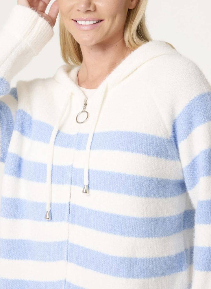 Soft striped hoody with pull up zip to front.
